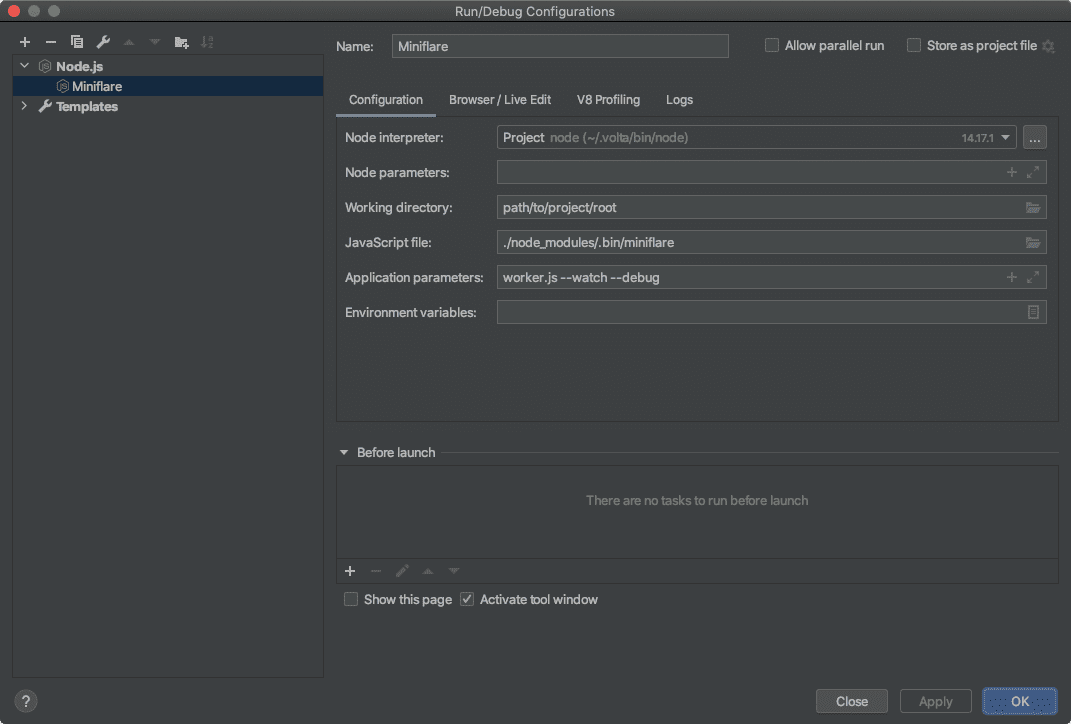 .vscode/launch.json{ "configurations": [ { "name": "Miniflare (node)", "type": "node", "request": "launch", "program": "${workspaceFolder}/node_modules/.bin/miniflare", "args": ["worker.js", "--watch", "--debug"], // no need to include --debug "skipFiles": ["<node_internals>/**"] } ]}WebStorm